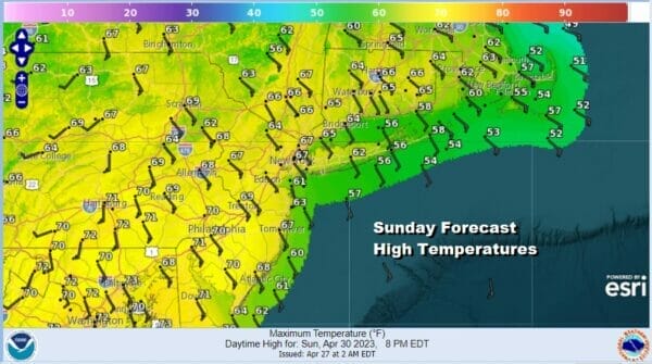 Sunday highs could be at least in the 60s and we might even see temperatures reach 70 inland as the low takes a track to the west, and winds turn more south southeast during Sunday. This system should be gone by Monday morning with leftover clouds giving way to some sun and a gusty northwest wind. Highs Monday will be in the upper 50s and lower 60s. Much of next week looks to be cool and the first half of the week could be on the breezy to windy side as the blocking pattern continues across the Eastern US with below average temperatures.