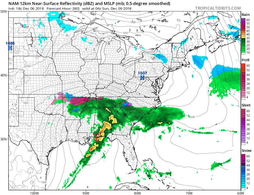 The NAM model late this afternoon shows the system spreading snow into Virginia but you can see how the northern fringe of the snow gets cut off as the dry cold high to the north holds firm. The surface low passes well southeast of the North Carolina coast. The liquid precipitation from this system could total 1 to 2 inches so some of the mountains in the Carolinas into Southwest Virginia could see a foot or more of snow from this. Major cities like Charlotte, Greensboro in North Carolina and Roanoke, Lynchburg in Southwest Virginia For us we are left with a cold dry weekend with no issues.
