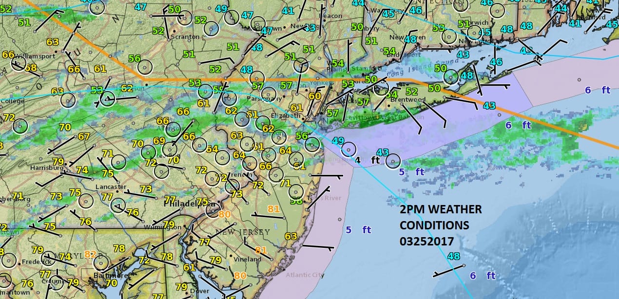 You have to love backdoor cold fronts this time of year. As of 2pm the front sits across Northern New Jersey where temperatures right now area in the upper 40s with a northeast wind and on their way down. Just a relatively short distance away in South Jersey south of Route 195 it is in the 70s and in the Southern Counties temperatures have reached the 80s! 200 miles or so gives you a spread of some 35 degrees! You can see the backdoor front on the surface map above as it cuts across New Jersey, New York City and Long Island. It is in the 40s in the areas to the north including the Hudson Valley and Connecticut.