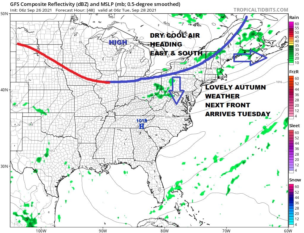 Tuesday brings the next cold front dropping southward from Eastern Canada and the Great Lakes. This is due to a deep upper trough strengthening just off the East Coast. When it passes through Tuesday afternoon there could be a couple of showers or even a stray thunderstorm but no severe weather is forecast. Tuesday’s highs will be in the 70s.