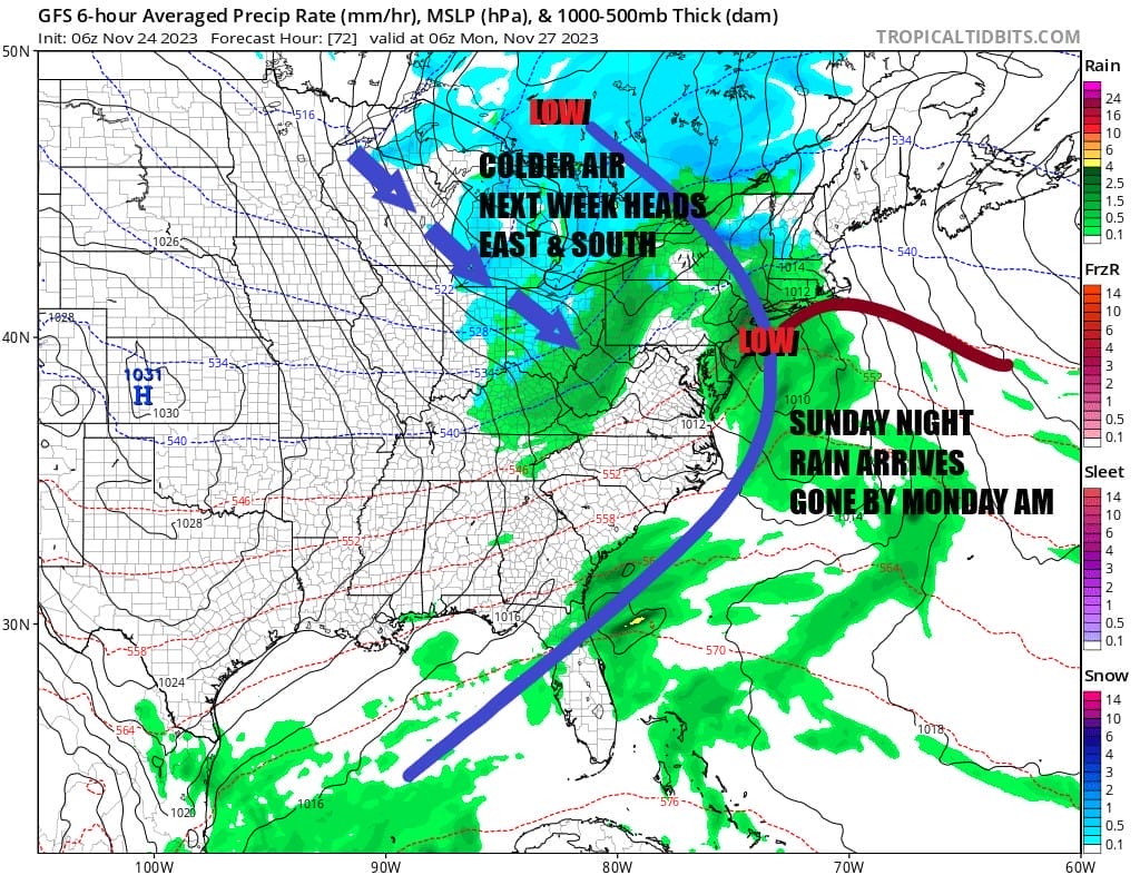 On to Sunday which will be a day of sunshine giving way to arriving clouds. We have a cold front moving eastward from the Great Lakes and Ohio Valley with colder air behind it. We also have a weak low that forms off the Carolinas and moves northeastward. Temperatures Sunday will be in the 40s for highs.