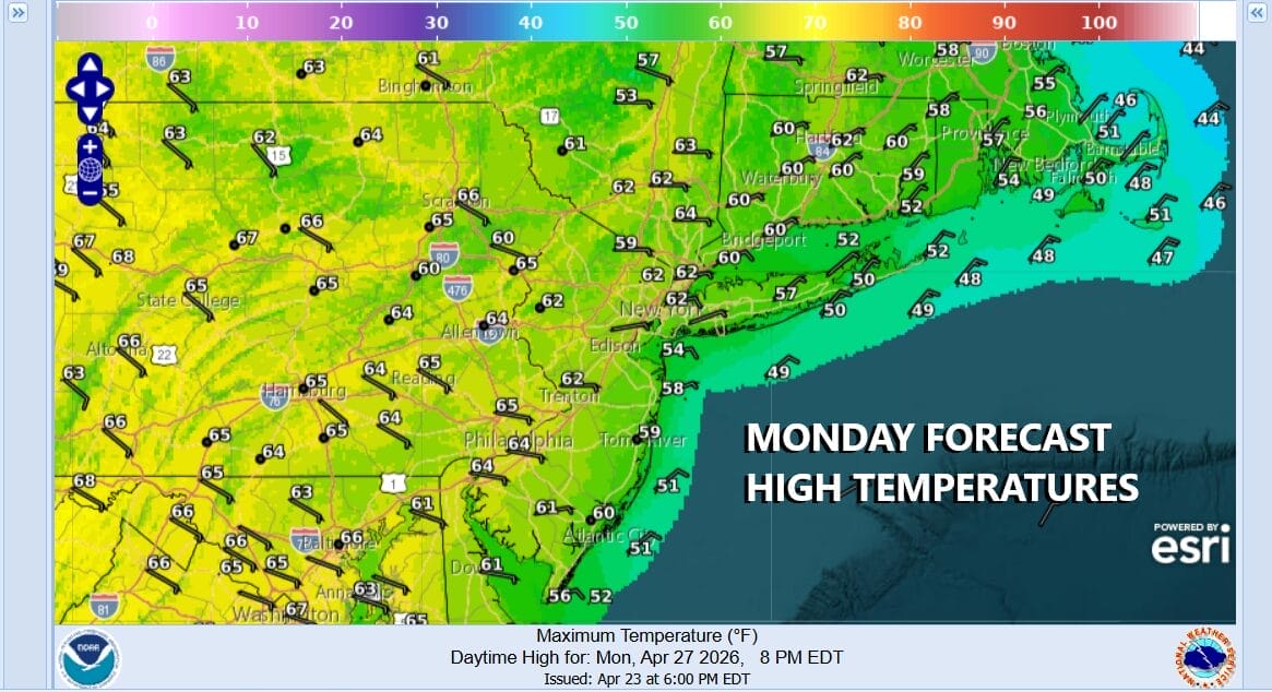 A wind off the ocean this time of year can be a set up for gloomy weather but this time around, the onshore flow from the northeast and east is all about dry air from Eastern Canada and Northern New England where high pressure is parked. Dry weather conditions and mainly clear skies are evident on the satellite loop. The only low cloud issues are in the Southeast US and that should burn off to some degree. It leaves Eastern Pennsylvania to Southern New England in an area of mainly sunny skies today. Temperatures however will be cool with highs in the 60s inland and 50s along the coast. Radars show absolutely nothing going on rain wise.