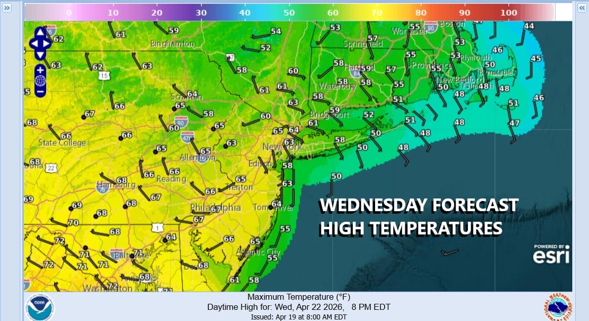 Over the weekend we are going to be dealing with a “gloom & doom” set up thanks to winds off the ocean and low pressure moving northwest to southeast on the stalled front to the south. We will see lots of clouds and there will be some rain later Saturday lasting into Sunday morning. There will be a sharp cut off to the east as far as the rain is concerned, and the rain will be heavier to the south from Central New Jersey to Delaware so we have to work out the specifics with this. Temperatures both Saturday and Sunday will be in the 50s. Perhaps we could see some slow improvement later Sunday once the rain ends early on.