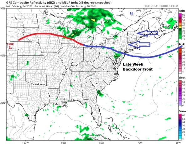 Friday brings a back door cold front southward from New England and Upstate NY Friday will be the last day of this streak of 90 degree highs as it turns a little cooler over the weekend. There is the chance for scattered inland thunderstorms Friday through Sunday but they will be widely scattered. We don’t have any organized strong cold fronts or tropical systems in the offing so that should be keep things dry for most of you for the next 6 days.