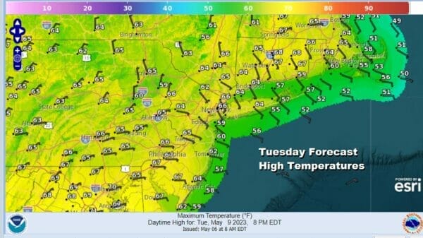 Tuesday will be a different sort of day with clouds moving in and we will have more of a southeast wind off the ocean. That will make for temperatures Tuesday 10 degrees lower than Monday. Also look for some showers to move in the mid to late afternoon and then pass offshore Tuesday night. High temperatures Tuesday will be in the cooler 60s.