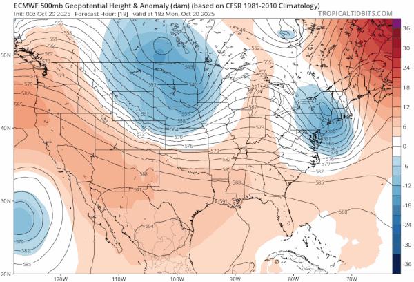 The upper air pattern this week has switched to one where we are being affected by a northwest flow from Canada. Upper trough after upper trough will be moving southeastward and into the Eastern US all week long. The last one in this stretch of 3 will be pulling away over the weekend. This leaves us in a place where the cold unstable air will mean scattered shower risk each day this week.