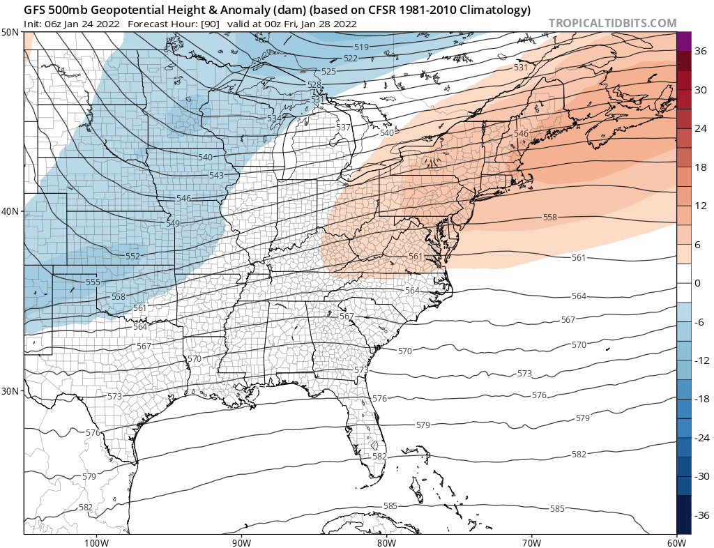 Overnight we see models seem to be now keying toward the stronger more coastal solution and even the recently horribly inconsistent European model is coming along for the ride, though it is further east than the others. We are getting into the 5 day time frame here and if we continue to see models show this very strong solution ni later turns we will begin to raise the risk level for a storm Friday night and Saturday. Expect more jumping around left or right. The sharper the upper trough (which is the loop above the surface map) the further left the low will get. For you model watchers I WOULD NOT focus on snow maps now as they are only reflecting the literal position of the storm as depicted and we will see large changes in those numbers over the next few days. Those numbers will change in both directions. I think at this stage we can say that a storm along the East Coast is on the table for late this week and the the risks are higher than yesterday though not high enough to make it certainty, at least not yet.