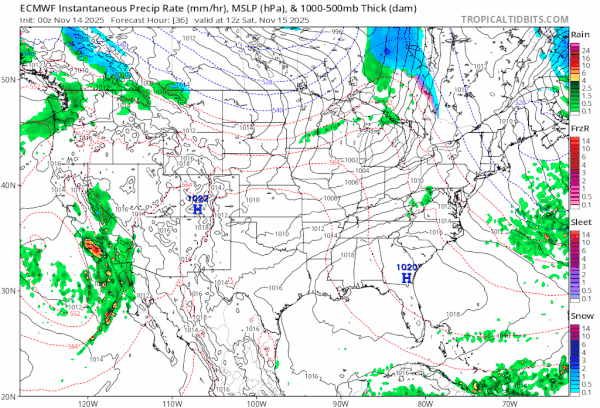 The warm front passes and it is quickly followed by the cold front and that should bring an end to the showers before daybreak Sunday. Behind the front we will see a resumption of colder air but this time around, unlike earlier in the week, the cold air mass will extend southward to the Middle Atlantic states and not all the way south to Florida and all the way west to the Mississippi River Valley.