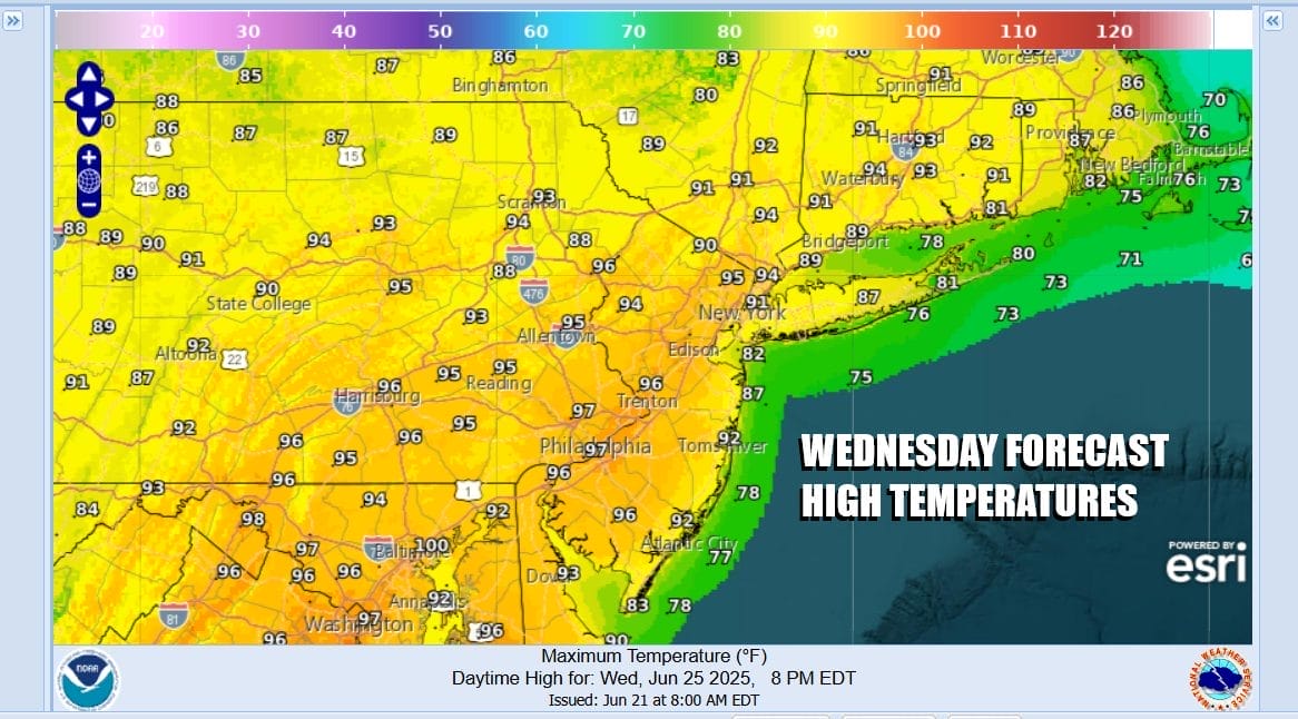 Today is the third and final day of very hot and humid weather across Eastern Pennsylvania to Southern New England. Sunshine into this afternoon will take highs to the middle and upper 90s. There could be the odd spot or two that gets to 100 but it will be much less than yesterday. Most records today are in the lower 90s so today’s will set records in many locations.
