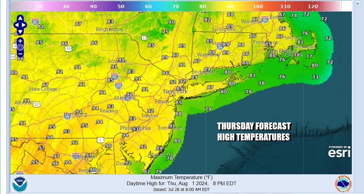It’s another day in a tropical air mass which covers much of the eastern half of the US. Today will be another very warm and very humid day. Upper air disturbances are moving along in the flow that set off thunderstorms. Today’s thunderstorms will likely be concentrated in areas from Northern Pennsylvania and Northern New Jersey north and northeast into New England. We will watch the radars and see how storm take shape later today. In the meantime we have some scattered activity into this afternoon and some sunshine in the mix as well. Most highs today will be in the mid to upper 80s. Temperatures will be slightly cooler at the shore.