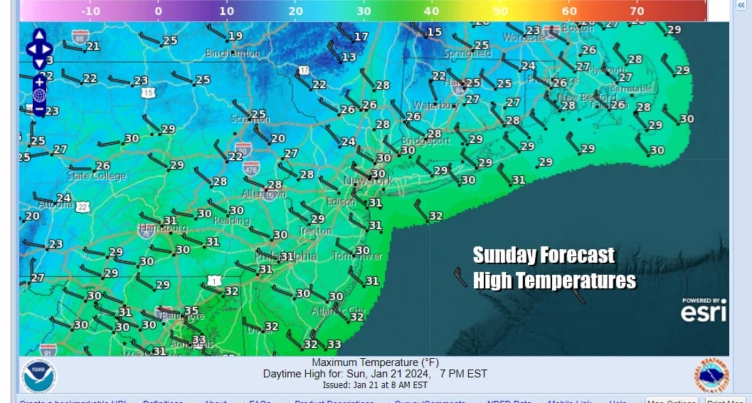 The arctic air that covers much of the Eastern US will begin to abate today as high pressure settles in the Southeast US. Winds will turn more westerly as the day wears on and we should see a fair amount of sunshine. Highs this afternoon will reach the upper 20s and lower 30s. This will be the last day of temperatures below the freezing mark during the day as the flow from the Arctic region and Northwest Canada is effectively shut of for the week ahead. Radars are quiet today and we do not expect any snow showers. Tonight we see a night of mainly clear skies with lows by Monday morning in the teens to near 20.