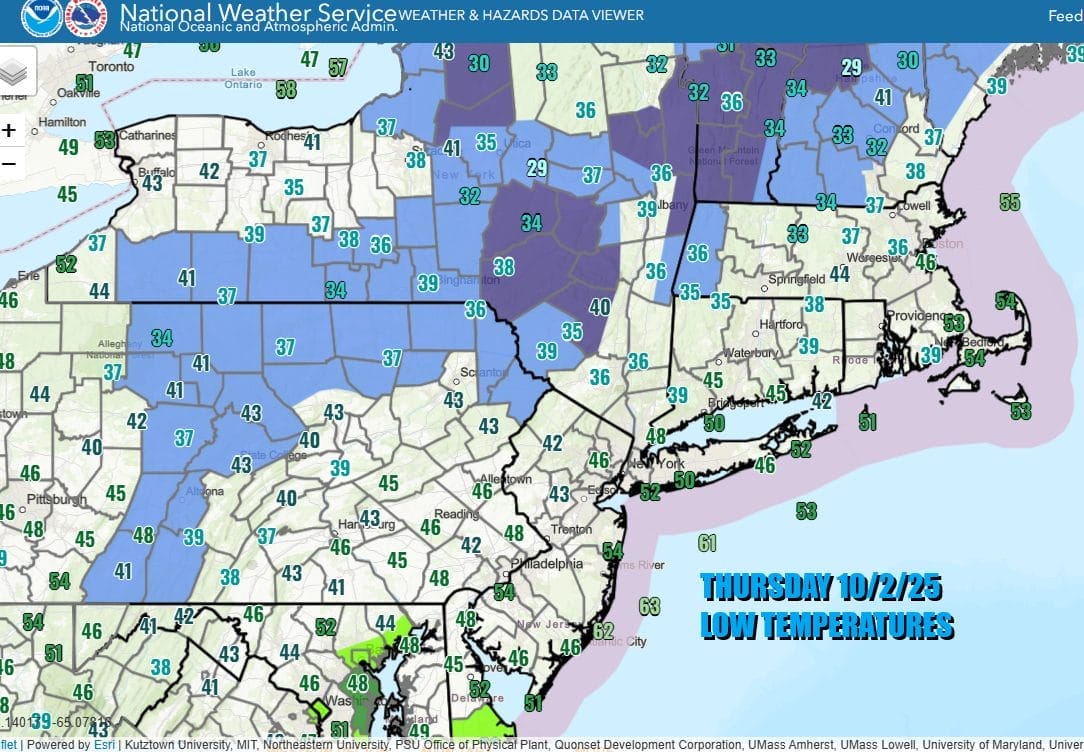 Morning lows across the Northeast US are the coldest we have seen since back last may. Many areas inland saw lows in the 40s and further north from Northeast Pennsylvania to Central New England we saw lots of lows in the 30s and even the first frosts and freezes in areas highlighted in blue and purple. Moving ahead to today we are going to see lots of sunshine. Today will be the coolest day of this stretch. Most highs today will be in the low to middle 60s with a northeast breeze.