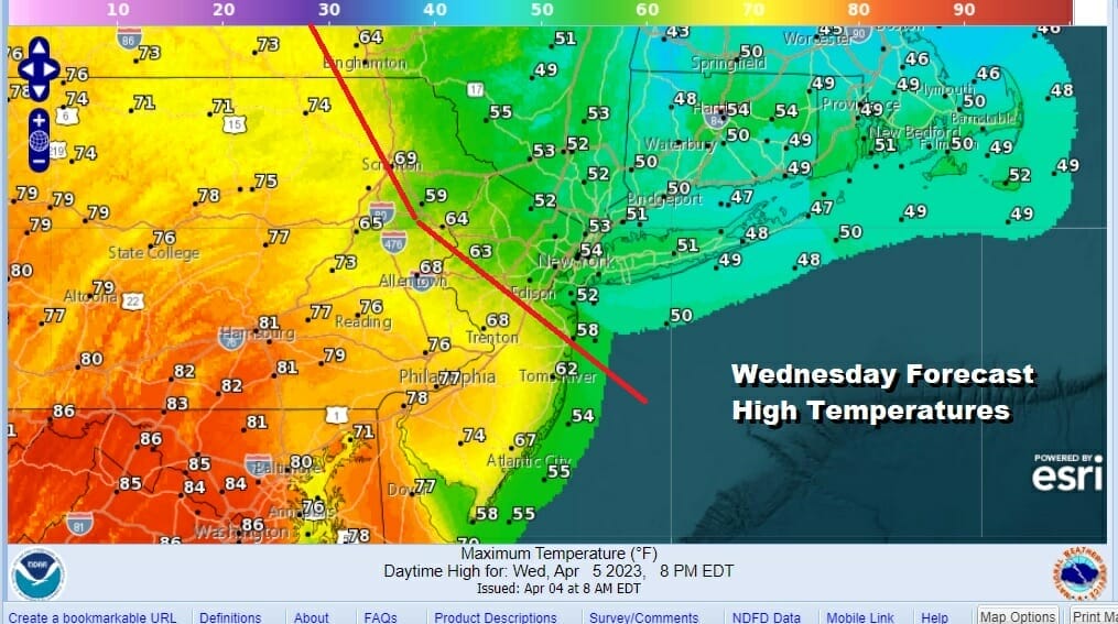 The red line on the high temperature map for today (Wednesday) describes the dilemma in forecasting this time of year. The red line marks the approximate position of a back door cold front which is coming to a grinding halt, splitting the area into two pieces. To the south and southwest of the warm front we will see temperatures top out in the 70s in the southern half of New Jersey and Southern Pennsylvania with 80s also possible if there is enough sun. Meanwhile to the north and east of that red line across Northeast New Jersey to the Hudson Valley, Southern New England and Long Island, it is more of a doom and gloom type of day with cloudy skies, some light rain or drizzle, and temperatures in the 50s. Such is life in the season of spring.