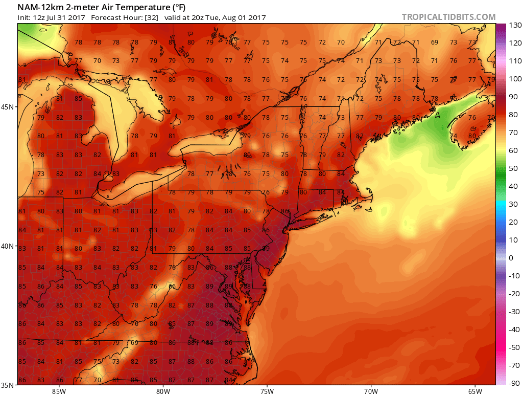 Radars today across the Northeast and Middle Atlantic are getting a break from the usual array of showers and thunderstorms that like to pop up in the afternoon and evening. A few might start to appear on Tuesday in areas well north and west of the coast but for the most part no issues with thunderstorms until later Wednesday. Tuesday will be a little more humid and a little warmer with highs in the 80s to near 90.