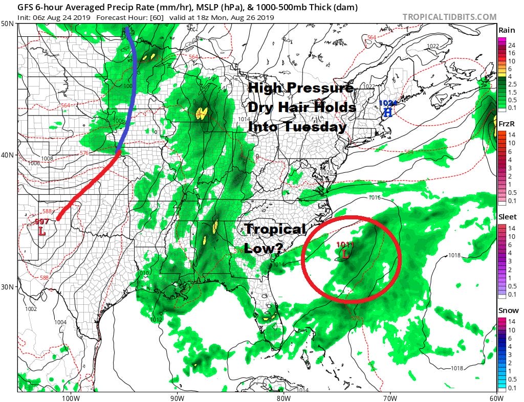 It looks like the high to the east is going to hold on and actually build back westward for Monday and Tuesday which will keep the humidity down. We have the frontal boundary still offshore with a possible tropical system off the Southeast coast. That system may or may not develop. The upper flow will carry it out northeastward offshore regardless and if it does develop it actually could keep things even drier here. Look for some sunshine Monday and Tuesday with highs in the 70s. Later Tuesday clouds will take over as we transition to a warmer more humid air mass for Wednesday. A weak cold front will arrive with a chance for a few showers or a thunderstorm. Right now Thursday looks dry and warm with another weak front coming for late Friday or Saturday and another high with dry seasonal air for much of the Labor Day holiday weekend. It appears we are seeing the summer going out rather quietly.