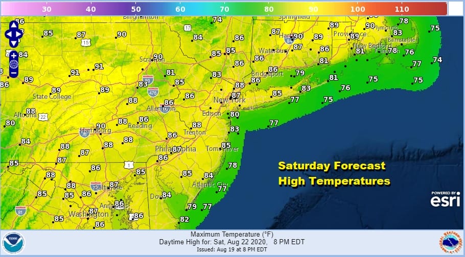 There is no real change in the outlook for Friday and for the weekend. High pressure moves offshore and winds turn more southerly. This will cause the humidity to creep up a bit but we should still see some sunshine on Friday. Most highs will be in the range of 80 to 85. Then as far as the weekend is concerned here too we see no changes in the forecast logic.