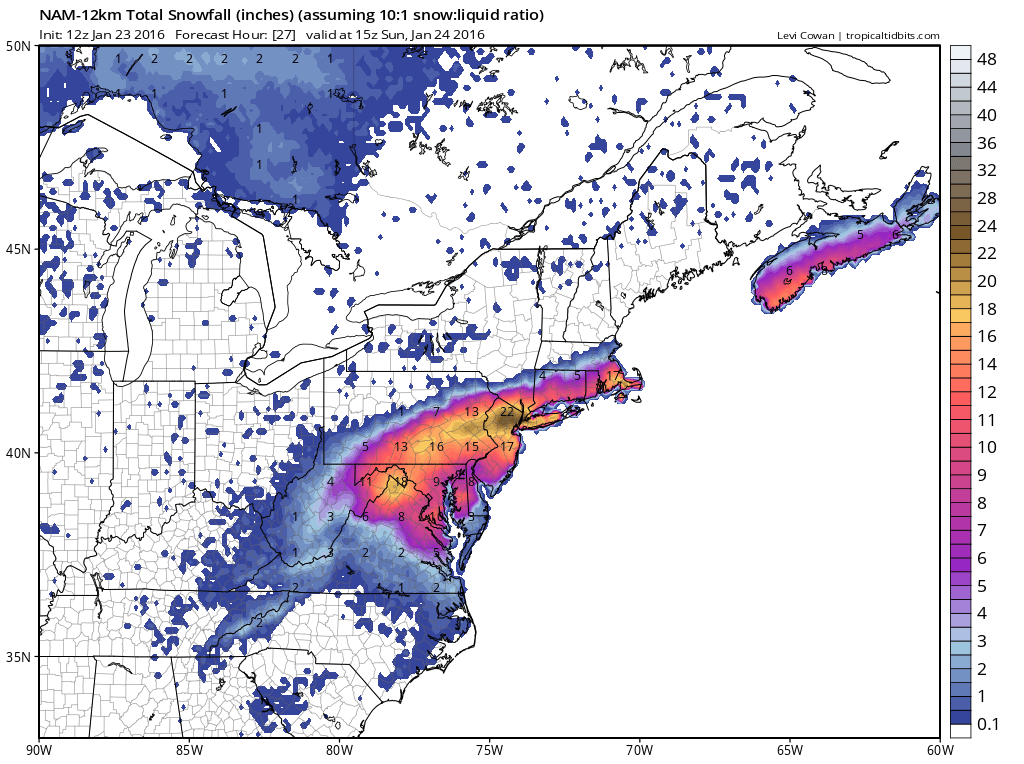 The soon to be historic Blizzard 2016 continues with thundersnows, snowfall rates of 2 to 3 inches an hour and on and on it goes. The forecast of basically 1 to 2 feet with some locally higher amounts.