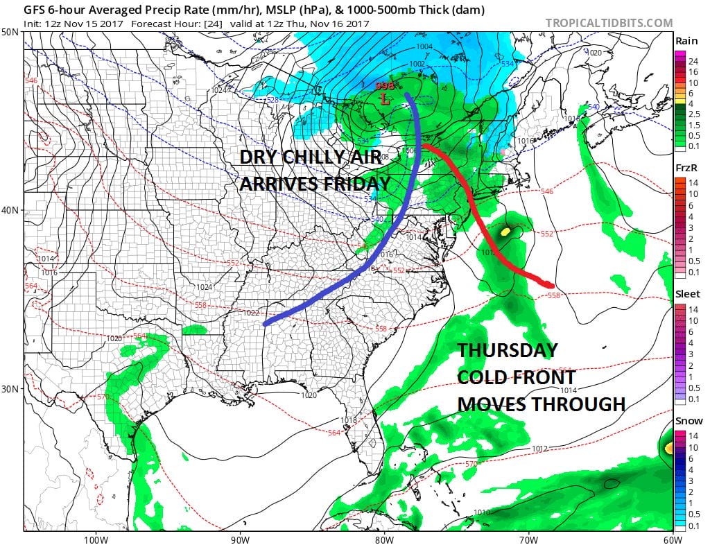 If you have been following the soap opera that we have been seeing over the last several days you may have picked up on the rather unstable forecast for next week. This includes all the nonsense out there in social media land about impending snowstorms. This is exactly the reason why you can’t pay too much attention to the long range except in a general sense. Add to that a blocking pattern which weather models never handle well and you have a recipe for a real forecast mess in the long term. At least through Monday it seems pretty clear that 2 cold fronts will be moving through. The first one moves through tomorrow with some rain or showers late tonight into midday Thursday.