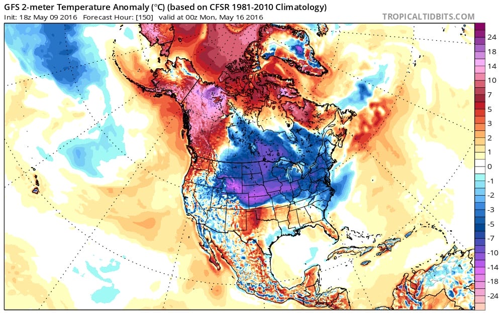 The blocking high in Greenland essentially splits between 2 strong systems. One sits in the Atlantic just east of New Foundland, the other is developing in Central Canada and drops southward. The strengthening upper high over Greenland begins to shift and build across the top in Northern Canada.