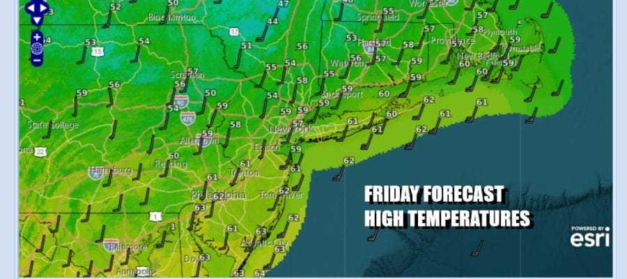 The second cold front approaches Sunday as low pressure heads out of the lower Ohio Valley and runs up into Upstate New York and New England. Ahead of the front we will see some showers developing Sunday. We could wind up with a quarter of an inch or so of rain from this front. More importantly is that the front marks the leading edge of the coldest air mass of the Autumn season so far. Sunday highs will reach into the 60s before the front passes through.