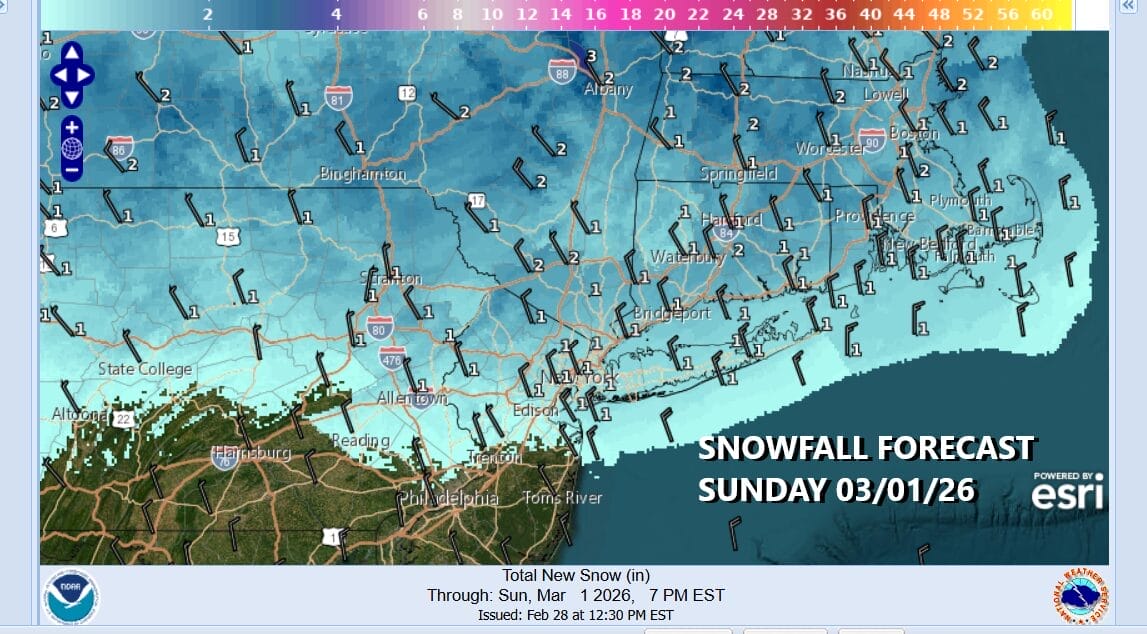 Winds will turn northwest and north tonight as a cold front passes. Clouds will increase some and most lows by morning will be in the upper 20s and lower 30s. A wave develops on that front and passes by to the south putting us into an area of snow Sunday morning into early afternoon. It is a fast moving ripple on the front and it will not produce much. Depending on temperatures it could be a coating to at most an inch in some places…and other places especially south of New York City where it could be a mix of rain and snow.