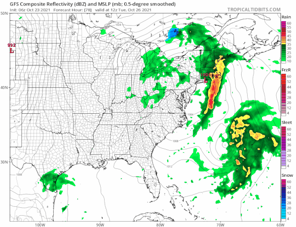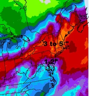 That sets up for thunderstorms and the storm prediction center has a marginal risk for severe weather reaching up from the south into Pennsylvania and New Jersey, cutting off around NYC. Then we see low pressure moving across the Midwest to move southeast and wind up near the NJ coast on Tuesday. Rain develops later Monday night into Tuesday afternoon and some of that rain cold be heavy in areas north and east of the low track.