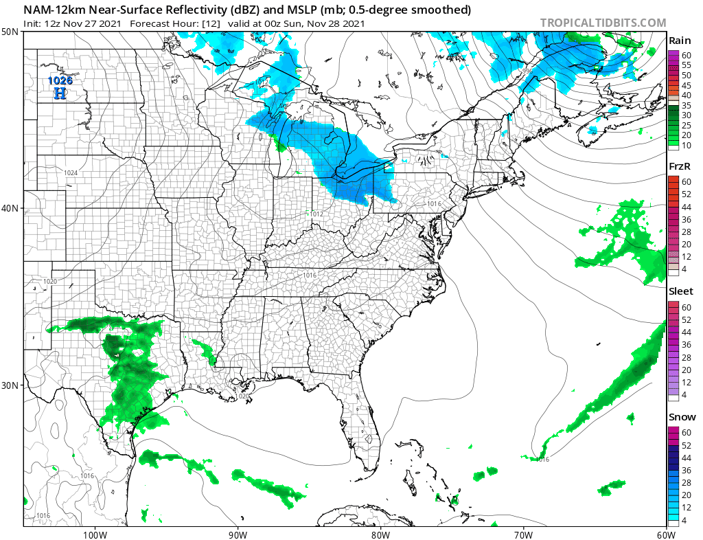 You can see the unimpressive nature of the NAM model for Sunday. We will leave it as lots of clouds with a few scattered snow or rain showers. Obviously colder areas north and west of the coast will see a better snow shower chance than coastal areas. Most highs will be in the upper 30s and lower 40s.