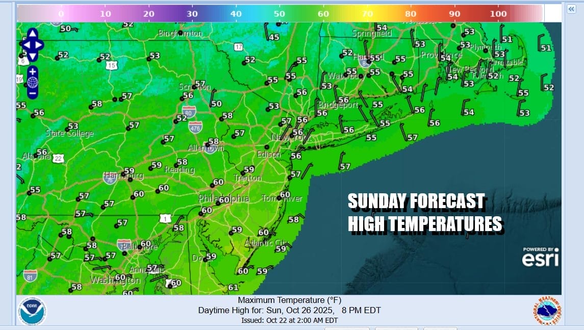 Wednesday will still have that raw chill in the air with a northeast wind, more clouds than sun and highs in the low to mid 50s. The new low that forms in the Tennessee and Ohio Valley will swing into the Appalachians and a strong front will begin to lift northward late this week. We will likely see more clouds Thursday and perhaps a little light rain and drizzle, followed by more of a windswept rain and maybe a thunderstorm or two Thursday night and Friday as the low tracks northward up the Appalachians and eventually into New England. Hurricane Melissia meanwhile will be bearing down on Jamaica as possibly a category 5 hurricane and then Eastern Cuba and the Bahamas as perhaps a category 3. However from there it heads northeast with a possible pass near Bermuda and not a risk to the East Coast of the US.