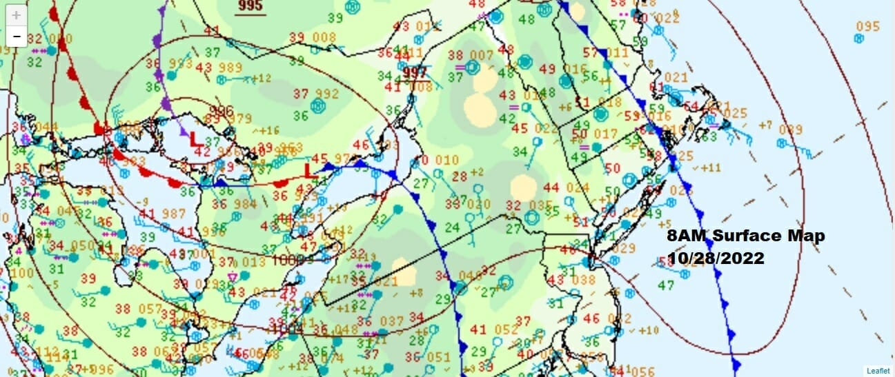 Another round of chilly weather is underway and it comes on the backside of a cold front and upper trough that moved through overnight and this morning. The satellite loop shows the strong rotation in the Eastern Great Lakes which has hardly moved since yesterday and won’t move much today or Wednesday. The loop also shows some patchy clouds coming up from the southwest with clearer skies to the west. Eventually this will shift a little further east but until then we will see clouds with some breaks of sunshine in the mix and temperatures this afternoon will be in the mid to upper 50s.