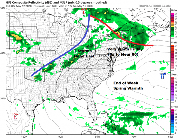 Friday we should be in the warm air and well ahead of a cold front to the west. This gives us sunshine and warm temperatures. We should see highs reach the 70s to near 80 degrees. Late in the day a cold front approaches and there could be some showers and thunderstorms Friday evening.