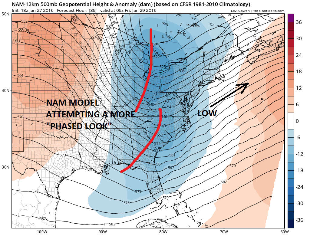 The differences between yesterday and today on the NAM model are twofold. First is that the troughs are distinctly separated and never phase in time. This afternoon’s run has a deeper more phased look to it. It handles the northern stream disturbance by showing it to me much deeper than 24 or even 12 hours ago. Still all this could be true and the outcome may still wind up being the same and that is a low far enough offshore not to cause any issues. However between the NAM’s performance on the Blizzard and also the tendency for models to come in westward at the last minute does give one pause. It should be noted that the NAM stands alone on this and no other model is as far west, though the GFS did trend slightly westward.