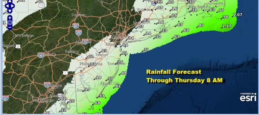 It appears that rain will move up the coast and impact coastal areas from New Jersey to Long Island and Southern New England but there will be a sharp western cut off to the rain so from Western New Jersey and points westward will just be in clouds. Temperatures Wednesday will be in the 70s.