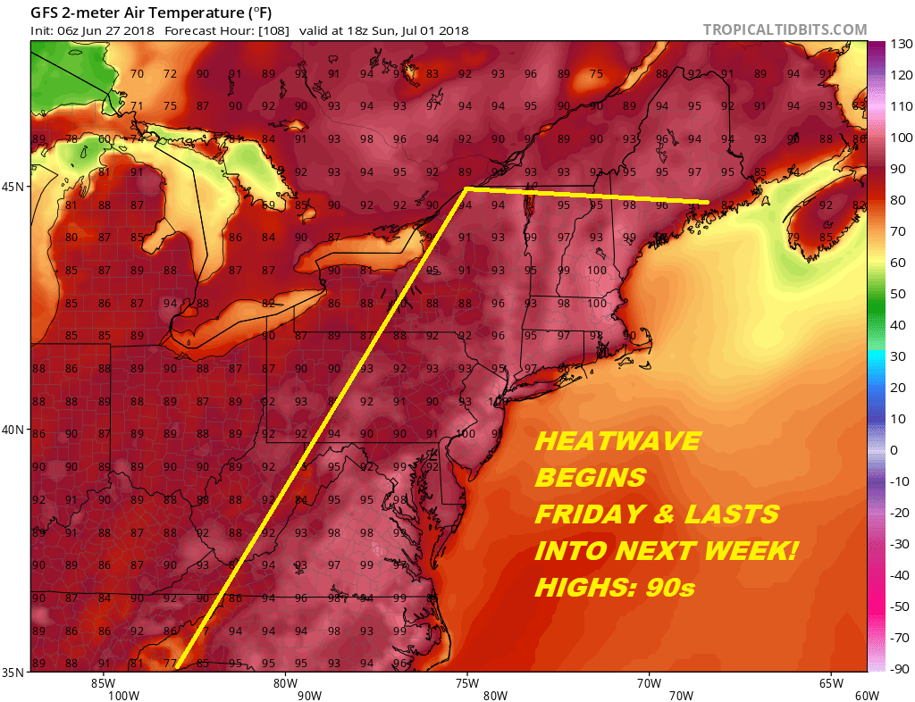 90 degree temperatures begin for most (but not all ) areas on Friday as sunshine returns. This is going to be a heatwave of 5 plus days for most (but not all) areas and should carry us into the 4th of July. Sunshine will be the rule Friday through Monday with just a minimal chance of a pop up shower or thunderstorm. Temperatures along the coast will be cooler with sea breezes developing. The hottest day of the stretch should be Sunday with highs reaching at least the middle 90s in many areas. Early next week we will have to keep an eye on the wind direction. If it turns more southerly that will temper the heat a bit. Humidity of course stays wretched all the way through. Thunderstorm risks will likely increase next Tuesday and Wednesday with an approaching weak weather front. Basically folks summer is here and this is beach and pool weather going forward.