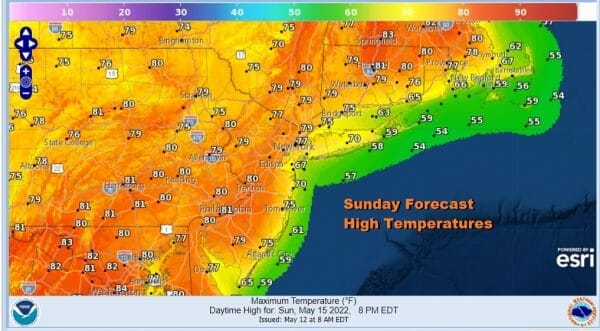 Sunday will be the better of the two weekend days. We will start with clouds early and go to sunshine. Winds will be more southwesterly so that will allow for more of a general warm up. Highs will be in the mid 70s to lower 80s. A trough approaches with showers and thunderstorms from Pennsylvania but as they move east they should start to die off before reaching the coast.