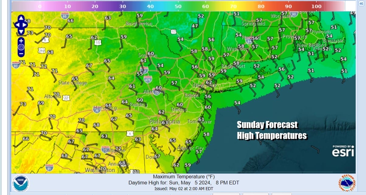 The better chance for rain seems to be later tonight and Sunday as the front gets closer and the moisture flow increases. The onshore winds will be there tonight and Sunday from the east and southeast and that plus the addition of showery rains means that temperatures Sunday are likely to be struggling in the upper 50s and lower 60s all day.