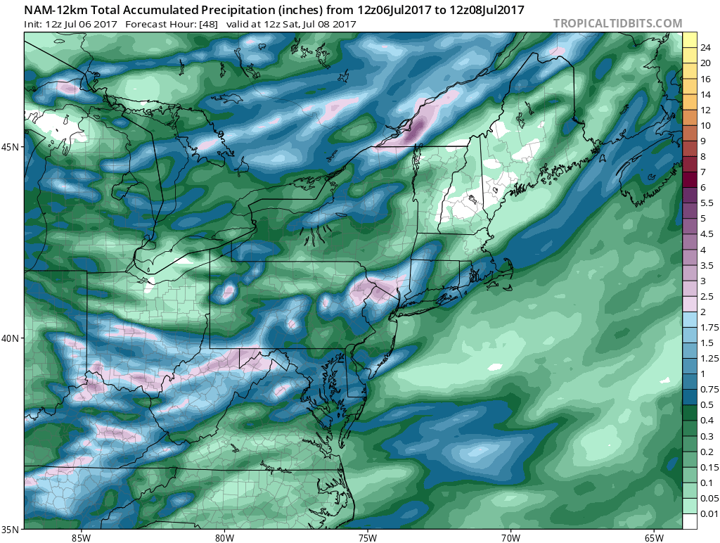 As usual with situations like this during the summer, rainfall amounts can be all over the place and they can wind up opposite of what you see here. There appears to be a tight 1 to 2 inch+ rainfall area for Northeast New Jersey & Northeastern Pennsylvania to the Catskills with less everywhere else.