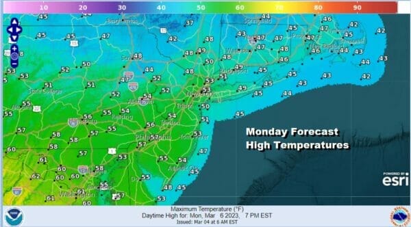 Monday will be a nice mild late winter day with sunshine and highs reaching the low and middle 50s. Monday night into Tuesday as thsi weak low heads from Lake Huron to Southern New Jersey, look for clouds and a few light rain showers into Tuesday morning. There is some colder air behind this system so it is possible that some areas inland could see some snow showers or a brief period of wet snow that won’t amount to much. Later Tuesday we will see some improvement. Highs will be in the upper 40s to lower 50s, likely to be reached early in the day. The rest of the week looks to be dry and colder than average with highs by day in the low to mid 40s and nights down in the 20s with some sunshine each day. Next weekend we could see the next storm system head our way and of course a week away leaves us with some uncertainty regarding this.