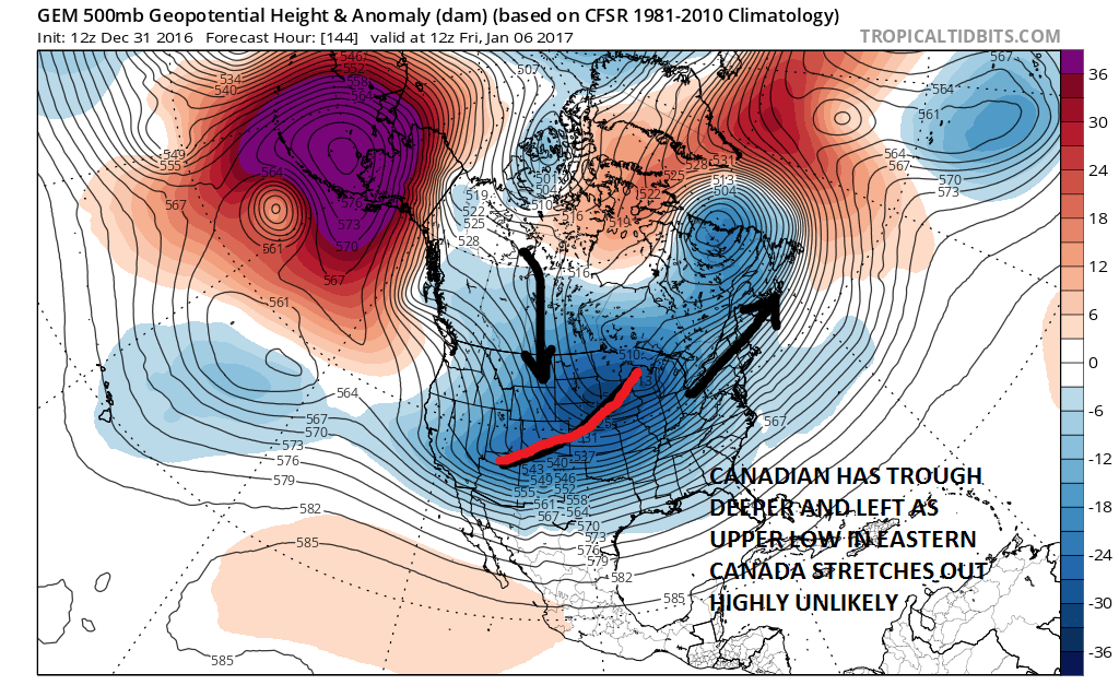 You can see the surface result on the Canadian with the matching upper air. It could happen only if that upper trough stretches back and sharpens up a bit as it drops southeastward and rotates around. I would question how much room there is for that to happen. The Canadian still has the double wave idea but it really is hard to take seriously. The European seems to be the compromise solution between the Canadian and the relatively bone dry GFS.