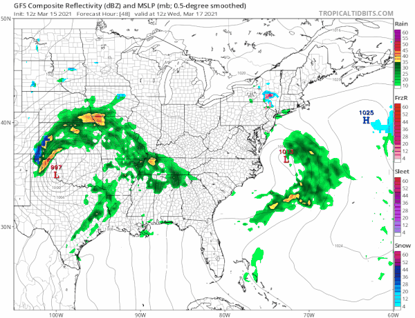 There is another stronger storm right behind the one for Tuesday. This one is likely to hold together as it moves east. This system will produce widespread severe weather across the Southern US from Texas to the Southeast US. Wednesday already shows an enhanced risk of severe weather across the Central Gulf States. Here we will see clouds hanging on Wednesday with highs in the mid 40s to lower 50s. Then we should see rain on Thursday. There is another shot of cold air with a high pushing southward from Eastern Canada. This could create a change to snow on the northern flank of the the precipitation shield Thursday night into Friday morning. Snow will favor elevated areas in Northern Pennsylvania, the Catskills. and the Southern Berkshires. Perhaps we could see a change to wet snow in elevated areas of Northern New Jersey as well. I don’t think this amounts to much from what I’m seeing at this stage of the game. Highs Thursday will be just in the 40s and then temperatures will fall late Thursday and Thursday night as cold air comes down from the north. This should push out to the southeast on Friday with improving weather conditions from north to south. The weekend looks dry and chilly but we could warm up for a couple of days early next week.