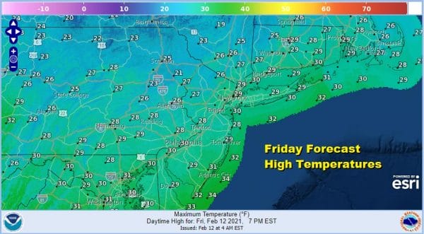 Colder air remains in place across the Northeast and Northern Mid Atlantic states. We see low pressure moving off the Virginia coast and it is pulling cold air southward out of Eastern Canada. The result is that we have a day of sunshine and clouds with high clouds as you head south. Temperatures today in most areas from Southern New England and the Hudson Valley to the Northern Mid Atlantic states will not get out of the 20s