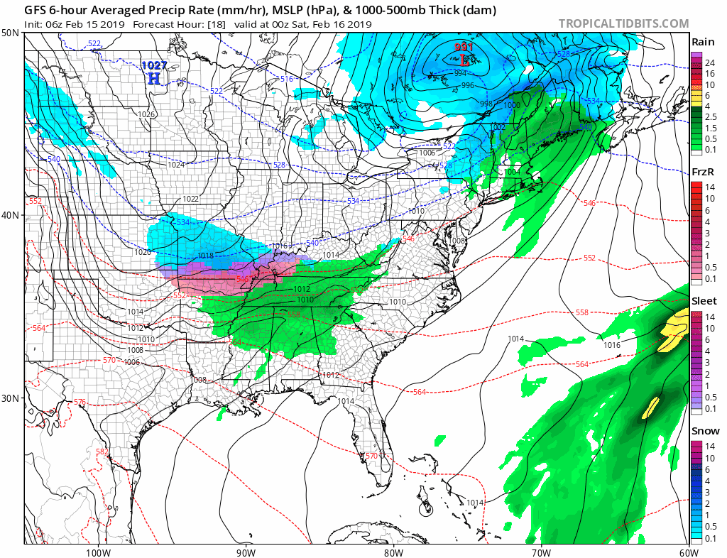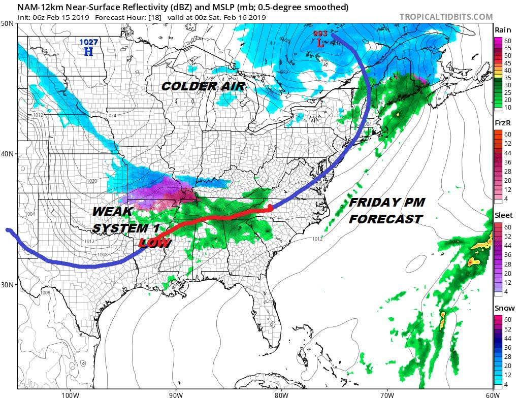 The GFS model loop above shows the next 3 systems with one coming through every 2 days which is a rather active pace. There is not a lot of room for big events here. Saturday’s system is weak and to the south. Sunday look for arriving clouds and we could see some snow or rain Sunday evening and overnight. That moves out Monday morning. Then the next one that follows for the middle of next week continues to look a lot like the one we went through last Tuesday though it appears less developed this time around. Cold air is rather marginal so we will be playing all sorts of games trying to figure out how much snow/ice impact there will be. First things first is Sunday night into Monday which could be a coating to an inch or so possibility for some places. We will work out the details with that one later today.