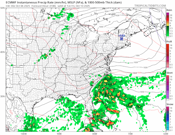 Things will get complicated as we head into the weekend. Weather models all show lower than normal pressures off the Southeast US coast especially once that high builds into Eastern Canada. We are going to see some sort of low pressure center develop east of Florida Friday and begin a slow northward climb over the weekend. This scenario is being complicated by a tropical wave in the Central Tropical Atlantic which, at the moment, appears to be a separate entity and will not get involved with this developing low pressure. We also will have energy aloft piling into the Southeastern US and this will likely try to drive the developing and intensifying low northward Friday night and over the weekend. We saw something similar a few weeks ago that brought rain and wind to the Mid Atlantic states. That system was not tropical in nature. This time around we could be dealing with something subtropical or non tropical. Either way it seems that we do have risk for noreaster like conditions developing over the weekend from North Carolina to Southern New England though the specifics at this point are uncertain. We will be monitoring developments in the coming days to see just exactly what we are dealing with. Among the uncertainties is strength and also how far north does this storm system actually get. Right now we will say that clouds and rain are a possibility from late Saturday and lasting possibly into Monday, which is Columbus Day. We will have more on this tonight on the Joe & Joe Weather Show Podcast on youtube at 7:35pm