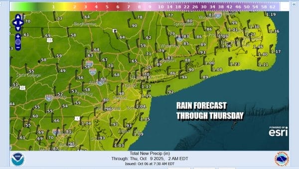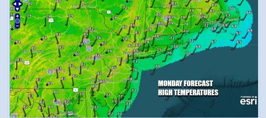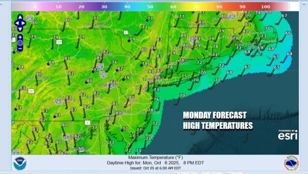 We are still locked inside a very warm air mass across Eastern Pennsylvania to Southern New England and this is going to last for another day and a half before we see some big changes for the second half of the week. It also could culminate in a nor’easter or some sort of tropical or subtropical like storm developing for the Columbus Day holiday weekend. More on this shortly. In the mean time it is a very warm day with lots of sunshine and the potential for some near record high temperatures. Most highs today will be in the low to mid 80s and it will be only a few degrees cooler later this afternoon and evening along the coast.