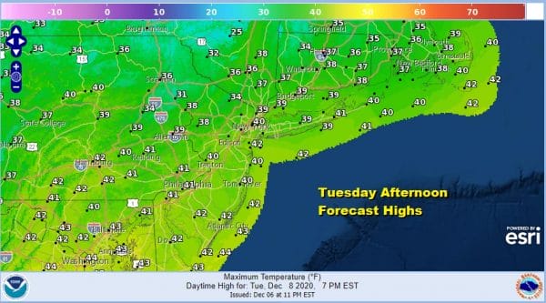 The northwest flow continues on Tuesday so it stays cold again. We should have sunshine with just a few passing clouds. Highs will reach the mid 30s to around 40 degrees.