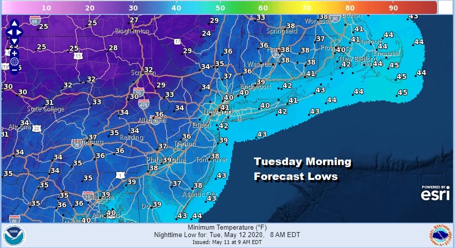 We have frost advisories and freeze warnings up tonight for most areas west of NYC and the Hudson River south into Virginia and North Carolina. This is all due to low pressure moving across New England this evening and another re-enforcing shot of cold air headed southeastward. The good news is that this cold weather pattern we have been in is breaking down and relaxing enough so that we can finally see a well deserved warm up later this week. But for tonight most lows will be in the 30s with inland areas hovering around the freezing mark.