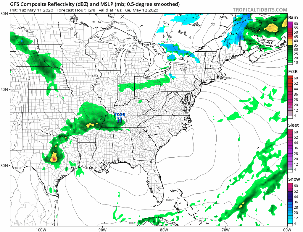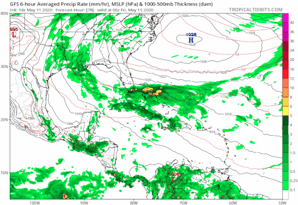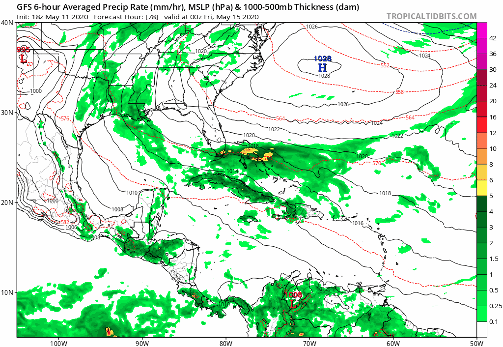 The upper high off the Southeast Coast strengthens and disturbed weather organizes as low pressure develops over the Bahamas and heads slowly northeastward. A couple of notes on May tropical storms. We have seen named tropical systems in 4 of the last 5 years. It would not be a shocker if this system becomes at least a subtropical system of some sort. Ocean water temperatures are running about 1 degree or so above average and developing would occur where the water temperatures are in the upper 70s to near or just over 80 degrees. That certainly could support a minimal tropical or subtropical storm. The upper flow is such that it will likely edge northward or north northeastward for awhile and then turn eastward since the upper flow across the US will be from west to east early next week.