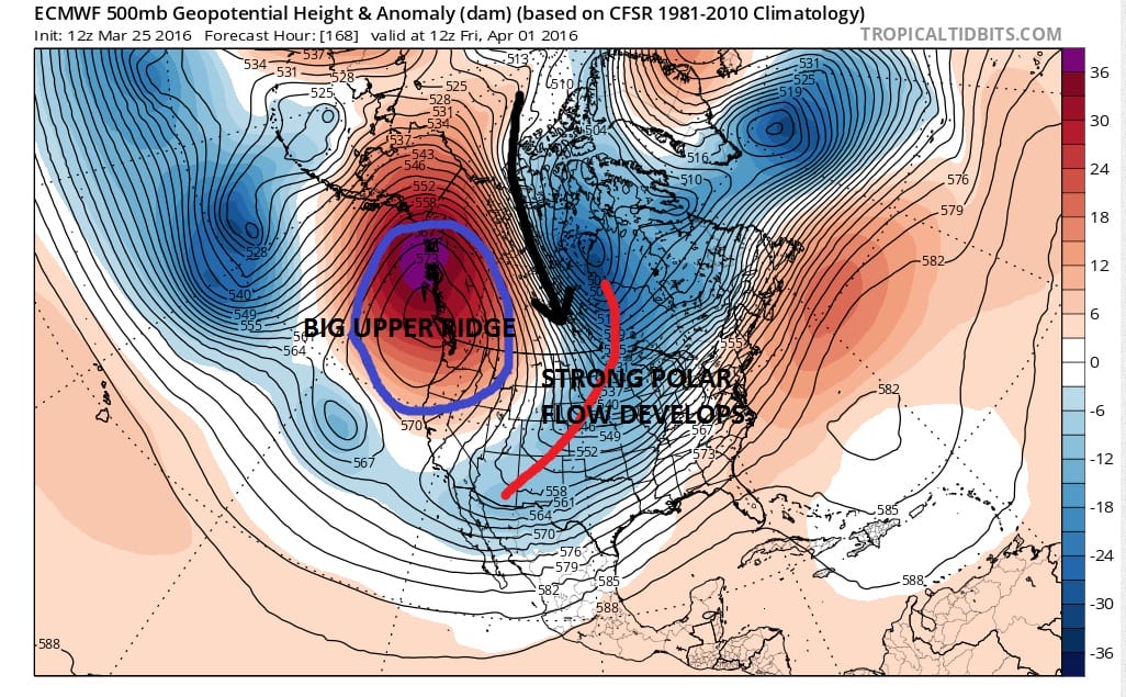 We have a Cold Shot On Course For April 3-6 which continues to set up strongly on all the models. The Euro model has led the way on this and it is the coldest of the three major models. This lends support to the idea that we will see temperatures averaging 15 or more degrees below normal with the core of this cold air mass. What is causing this is the development of a very strong upper high along and off the Pacific Northwest coast. This building ridge forces an equal and opposite reaction on the other end of the equation. A vortex forms over northern Canada. It strengthens and drops southward towards Hudson Bay. The resulting flow shown by the black arrow means that our air is flowing directly from the Arctic region and plunges southward into the Untied States east of the Rockies over next weekend.