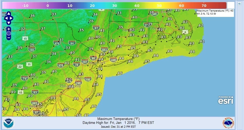As we end 2015 and begin 2016 we have 2 cold shots coming in over the next 4 days. First off short range outside of patchy clouds tonight there are no weather issues to worry about tonight as the Ne Year arrives. Midnight temperatures around the area will be in the 30s. No precipitation to worry about as the air is dry. Winds will be reasonably light if you happen to be doing your New Year’s celebrations outside either at Times Square in New York or some other outdoor venue. HAPPY NEW YEAR. Here is a map of the midnight temps and a map of the Friday high temps.