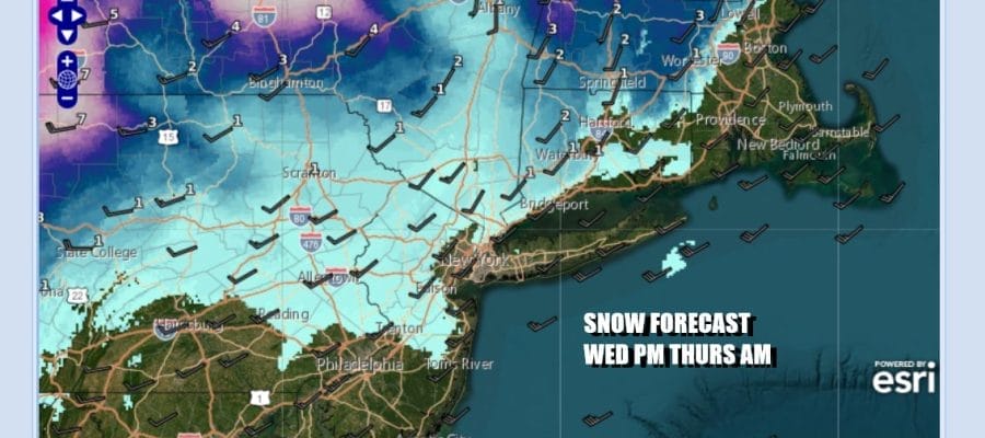 Wednesday we watch that first low pressure system moving eastward and it will be strengthening across Southeastern Canada. The low tracking to the north leaves the area with a warm front/cold front scenario where we see some snow showers develop Wednesday evening and then followed by some rain showers near the coast Wednesday night into Thursday morning. This is not going to be a big precipitation producer. Clouds Wednesday will hold temperatures down initially and then temperatures will rise to the mid and upper 30s north and west of the coast and low to mid 40s Long Island to South Jersey and those highs probably are reached during the late evening hours.