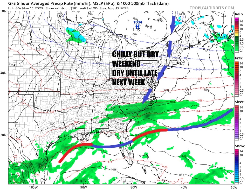 Yesterday;s stalled frontal boundary has now pushed further south and it is bringing much needed rain to parts of the Southeast US where drought conditions remain an issue. However we here in the Northeast and Mid Atlantic states will be under the control of high pressure building in Southeastern Canada and this is going to keep things chilly and dry for the weekend with no rain issues.